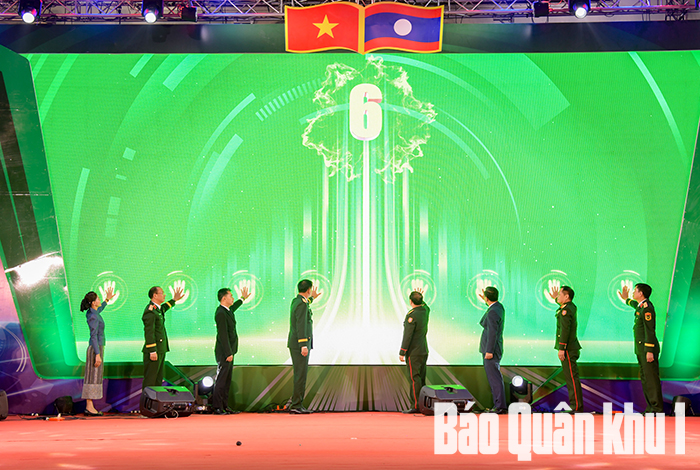 Đại biểu lãnh đạo Bộ Quốc phòng Việt Nam và đại biểu nước bạn Lào thực hiện nghi lễ khai mạc Hội chợ Triển lãm.