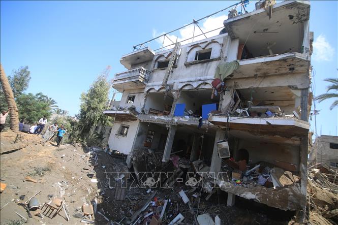 Một tòa nhà bị phá hủy sau vụ oanh kích của Israel xuống thành phố Khan Younis, Dải Gaza ngày 12/5/2021. Ảnh: THX/TTXVN