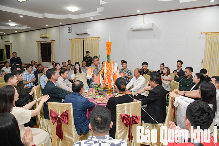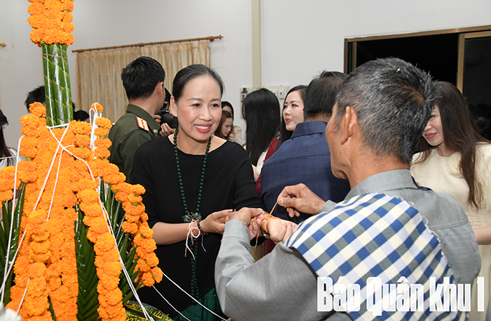 Phong tục buộc chỉ cổ tay là nghi lễ thiêng liêng của người Lào, biểu trưng cho sự gắn kết cộng đồng và mong ước những điều tốt lành. Sự xuất hiện của nghi lễ này trước buổi giao lưu không chỉ là sự hiếu khách, mà còn là minh chứng sinh động cho tình cảm đặc biệt mà quân đội và nhân dân Lào dành cho Đoàn Văn công Quân khu 1.