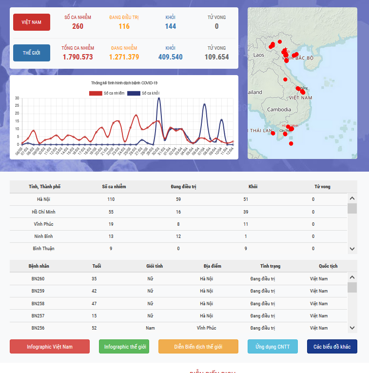 Như vậy, tính đến hiện tại, Việt Nam đã ghi nhận tổng số 260 trường hợp mắc COVID-19. Trong đó có 159 người (61,2%) mắc bệnh từ ổ dịch nước ngoài về Việt Nam; 101 người (38,8%) trong nước lây thứ phát. Có 118/159 người từ nước ngoài về được đưa vào cách ly ngay, sau đó xét nghiệm dương tính với SARS-cov-2.