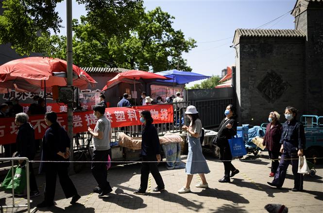 Người dân xếp hàng thực hiện biện pháp giãn cách xã hội khi vào chợ tại Bắc Kinh, Trung Quốc, ngày 10/5/2020. Ảnh: AFP/TTXVN