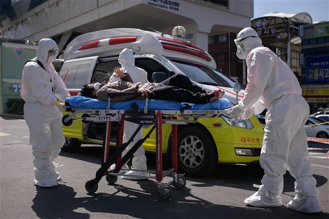 Chuyển bệnh nhân nhiễm COVID-19 tới bệnh viện ở Daegu, Hàn Quốc. Ảnh: AFP/TTXVN