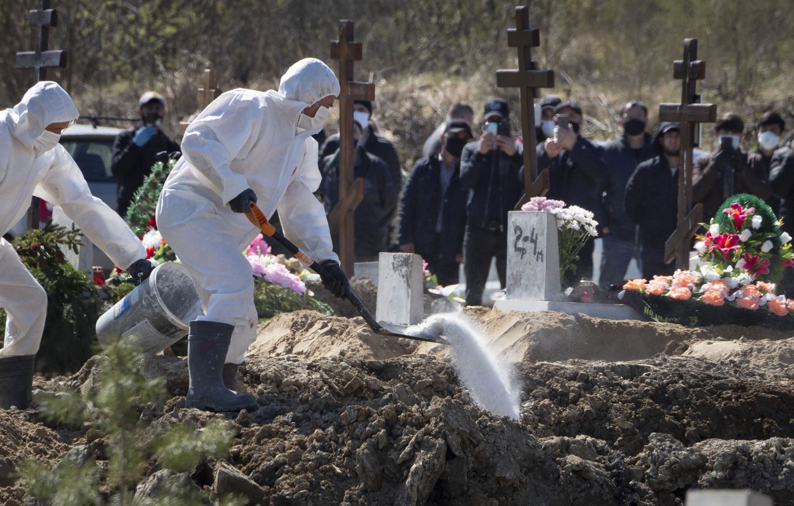 Nhân viên dịch tễ phun thuốc khử khuẩn lên một quan tài nạn nhân COVID-19 tại nghĩa trang ở Kolpino, Nga, ngày 10/5/2020. Ảnh: AP