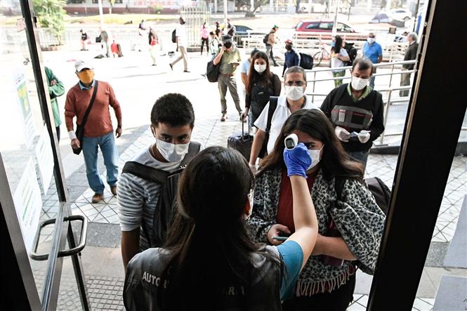 Kiểm tra thân nhiệt cho hành khách tại bến xe buýt ở Santiago, Chile, ngày 20/4/2020 trong bối cảnh dịch COVID-19 lan rộng. Ảnh: THX/ TTXVN