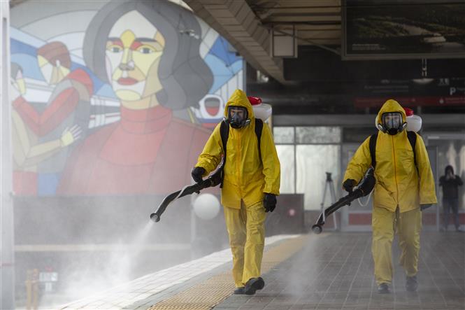 Phun thuốc khử trùng nhằm ngăn chặn sự lây lan của dịch COVID-19 tại Moskva, Nga ngày 19/5/2020. Ảnh: THX/TTXVN