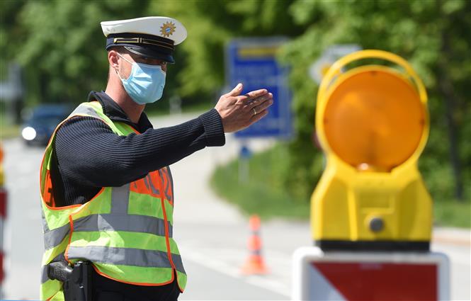 Cảnh sát Đức đeo khẩu trang phòng lây nhiễm COVID-19 khi làm nhiệm vụ tại cửa khẩu biên giới Đức - Áo ngày 7/5/2020. Ảnh: AFP/ TTXVN
