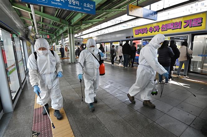 Phun thuốc khử trùng nhằm ngăn chặn sự lây lan của dịch COVID-19 tại Seoul, Hàn Quốc ngày 13/3/2020. Ảnh: AFP/TTXVN