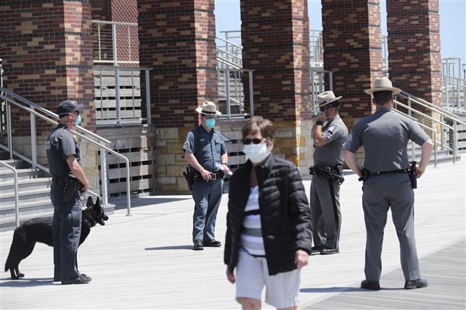 Cảnh sát gác trên bãi biển ở New York, Mỹ, ngày 22/5/2020. Ảnh: THX/TTXVN