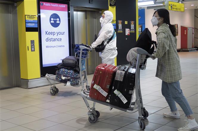 Hành khách tại sân bay Heathrow ở London, Anh, ngày 1/5/2020. Ảnh: THX/TTXVN