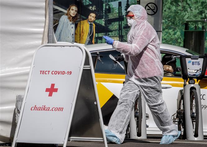 Nhân viên y tế làm nhiệm vụ tại một điểm xét nghiệm COVID-19 ở Moskva, Nga ngày 2/5/2020. Ảnh: AFP/TTXVN