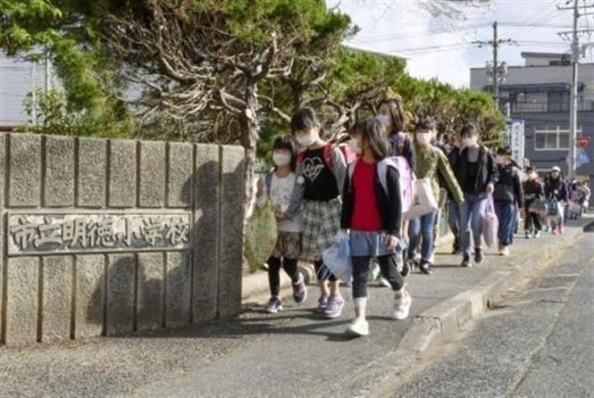 Học sinh tới trường ở Tottori, miền tây Nhật Bản, ngày 7/5/2020. Ảnh: Kyodo/ TTXVN