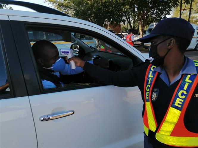 Cảnh sát Nam Phi đo thân nhiệt cho một lái xe. Ảnh: Phi Hùng-P/v TTXVN tại Nam Phi