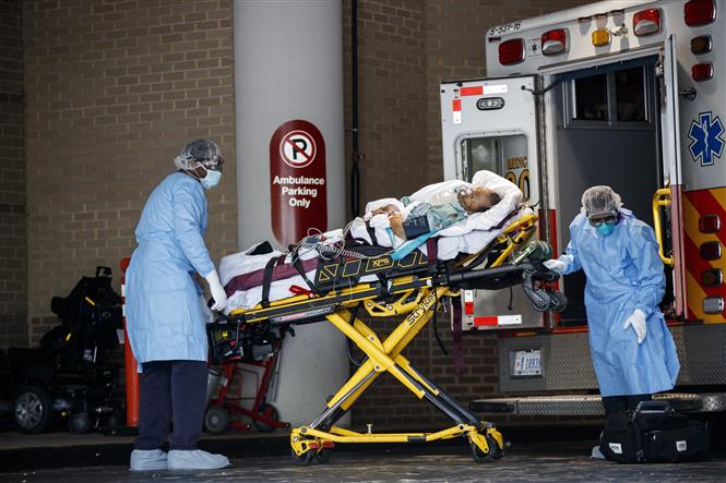 Nhân viên y tế chuyển bệnh nhân COVID-19 tới bệnh viện Đại học George Washington ở Washington D.C., Mỹ, ngày 27/4/2020. Ảnh: THX/ TTXVN