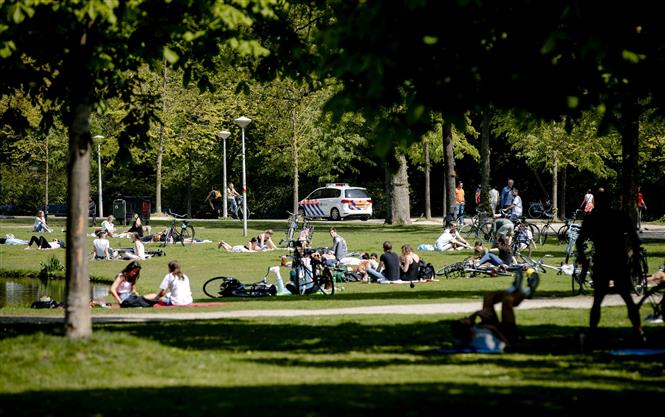 Người dân sưởi nắng tại một công viên ở Amsterdam, Hà Lan ngày 27/4/2020. Ảnh: AFP/TTXVN