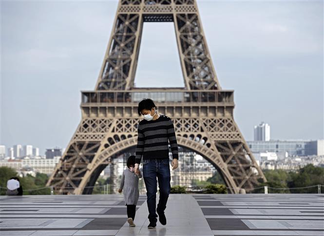 Trẻ em thăm Tháp Eiffel ở Paris, Pháp trong bối cảnh dịch COVID-19 bùng phát mạnh, ngày 20/4/2020. Ảnh: AFP/TTXVN