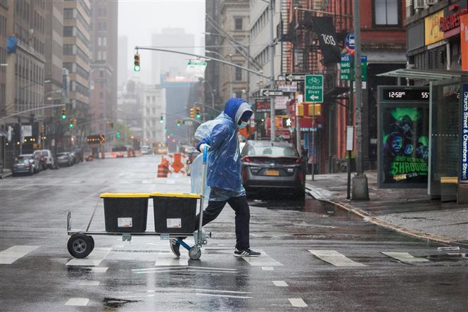 Công nhân chuyển hàng hóa trên đường phố tại New York, Mỹ ngày 13/4/2020 trong bối cảnh dịch COVID-19 lan rộng. Ảnh: THX/TTXVN