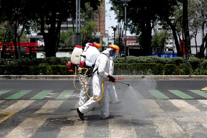 Phun thuốc khử trùng nhằm ngăn chặn sự lây lan của dịch COVID-19 tại Mexico City, Mexico ngày 6/4/2020. Ảnh: THX/TTXVN