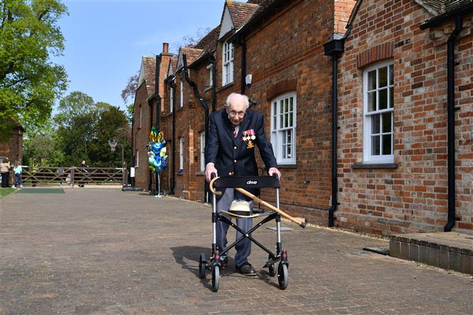 Cụ ông Tom Moore, 99 tuổi, nỗ lực thực hiện dự án đi bộ 100 vòng trong khu vườn ở Marston Moretaine, phía bắc London, ngày 16/4/2020 nhằm gây quỹ hỗ trợ đội ngũ y tế Anh đối phó dịch COVID-19. Ảnh: TTXVN phát