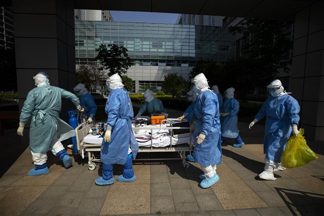 Nhân viên y tế chuyển bệnh nhân COVID-19 tại bệnh viện ở Vũ Hán, tỉnh Hồ Bắc, Trung Quốc ngày 12/4/2020. Ảnh: THX/TTXVN