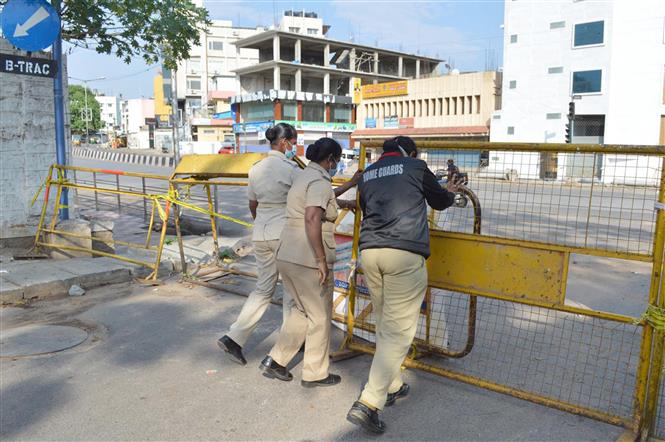 Lực lượng an ninh dựng các chốt để ngăn người dân di chuyển sang khu vực lân cận nhằm kìm chế sự lây lan của dịch COVID-19 tại Bangalore, Ấn Độ ngày 11/4/2020. Ảnh: THX/TTXVN