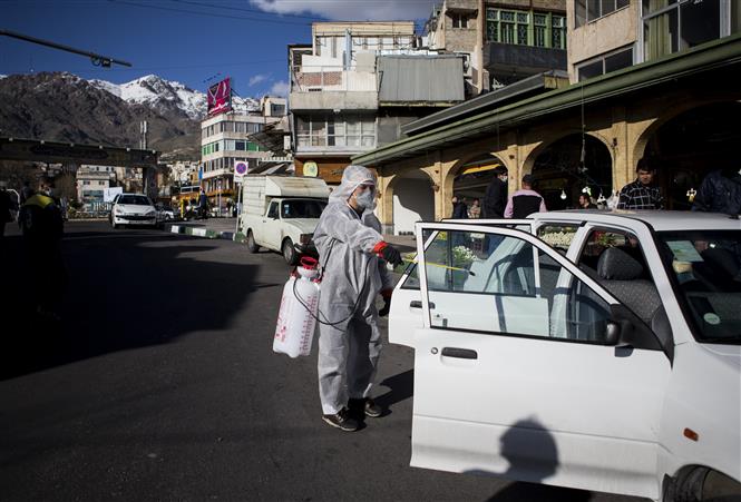 Phun thuốc khử trùng nhằm ngăn chặn sự lây lan của dịch COVID-19 tại Tehran, Iran ngày 31/3/2020. Ảnh: THX/TTXVN