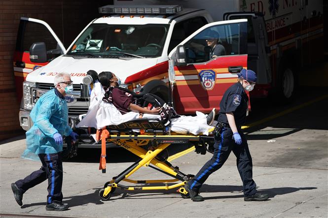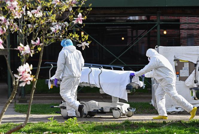 Nhân viên y tế chuyển thi thể bệnh nhân tử vong do COVID-19 tới nhà xác dã chiến ở New York, Mỹ, ngày 8/4/2020. Ảnh: AFP/TTXVN