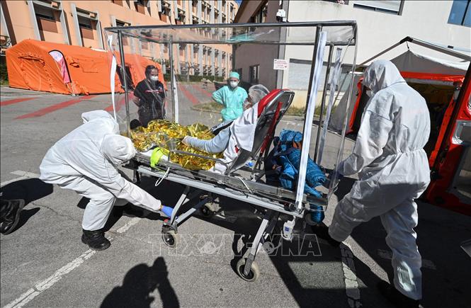 Nhân viên y tế chuyển bệnh nhân nhiễm COVID-19 tại bệnh viện ở Marseille, Pháp, ngày 14/4/2020. Ảnh: AFP/TTXVN