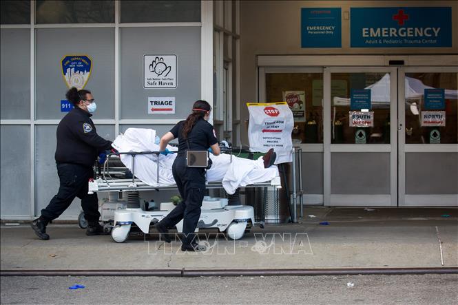Nhân viên y tế chuyển bệnh nhân mắc COVID-19 vào một bệnh viện ở New York, Mỹ ngày 8/4/2020. Ảnh: THX/TTXVN