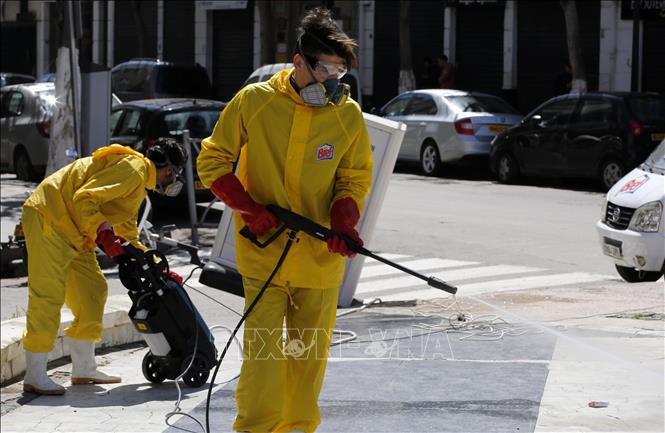 Phun thuốc khử trùng nhằm ngăn chặn sự lây lan của dịch COVID-19 tại Algiers, Algeria ngày 30/3/2020. Ảnh: THX/TTXVN