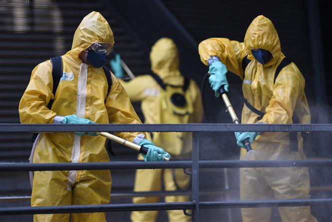 Phun thuốc khử trùng nhằm ngăn chặn sự lây lan của COVID-19 tại trạm xe buýt ở Belo Horizonte, Brazil, ngày 9/4/2020. Ảnh: AFP/ TTXVN
