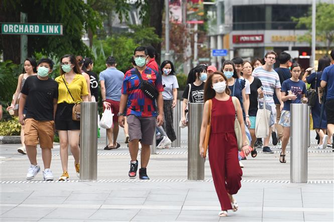 Người dân đeo khẩu trang nhằm ngăn chặn sự lây lan của dịch COVID-19 tại Singapore ngày 5/4/2020. Ảnh: AFP/TTXVN