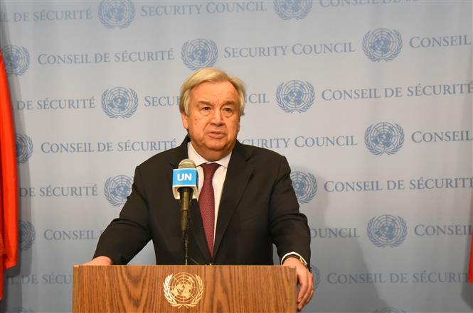 TTK LHQ Antonio Guterres phát biểu trong cuộc họp báo tại New York, Mỹ. Ảnh: THX/ TTXVN
