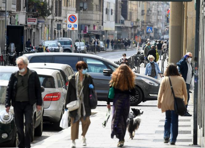 Người dân đeo khẩu trang phòng lây nhiễm COVID-19 trên đường phố tại Milan, Italy ngày 18/4/2020. Ảnh: THX/ TTXVN