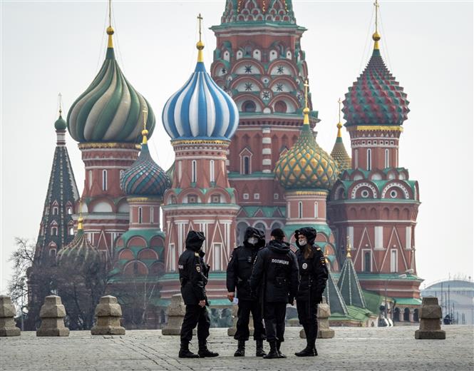 Lực lượng an ninh Nga tuần tra trên Quảng trường Đỏ ở Moskva trong thời gian lệnh hạn chế đi lại được áp đặt nhằm ngăn dịch COVID-19 lây lan, ngày 13/4/2020. Ảnh: AFP/TTXVN