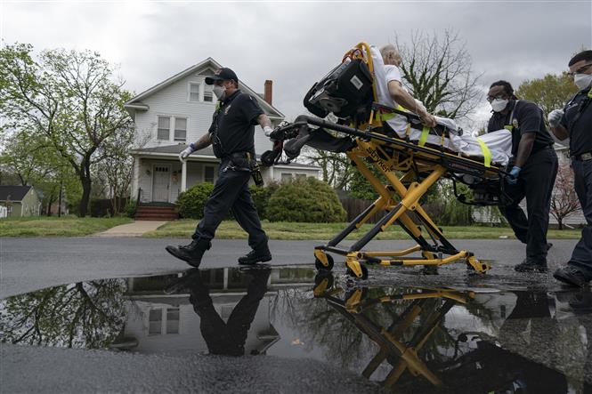 Nhân viên y tế chuyển bệnh nhân mắc COVID-19 tới bệnh viện ở Glen Burnie, Maryland, Mỹ ngày 13/4/2020. Ảnh: AFP/TTXVN