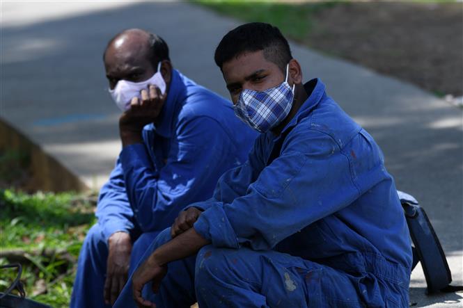 Người lao động đeo khẩu trang nhằm ngăn chặn sự lây lan của dịch COVID-19 tại Singapore ngày 15/4/2020. Ảnh: AFP/TTXVN