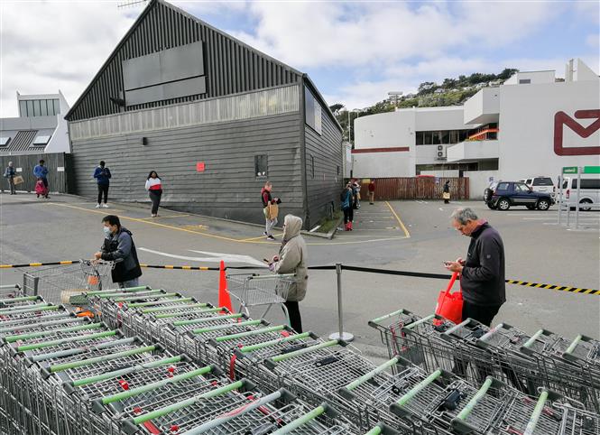 Người dân thực hiện giãn cách xã hội khi xếp hàng bên ngoài siêu thị ở Wellington, New Zealand ngày 11/4/2020 trong bối cảnh dịch COVID-19 lan rộng. Ảnh: THX/ TTXVN