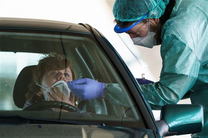 Nhân viên y tế lấy mẫu xét nghiệm COVID-19 tại Burgos, Tây Ban Nha ngày 28/3/2020. Ảnh: AFP/TTXVN