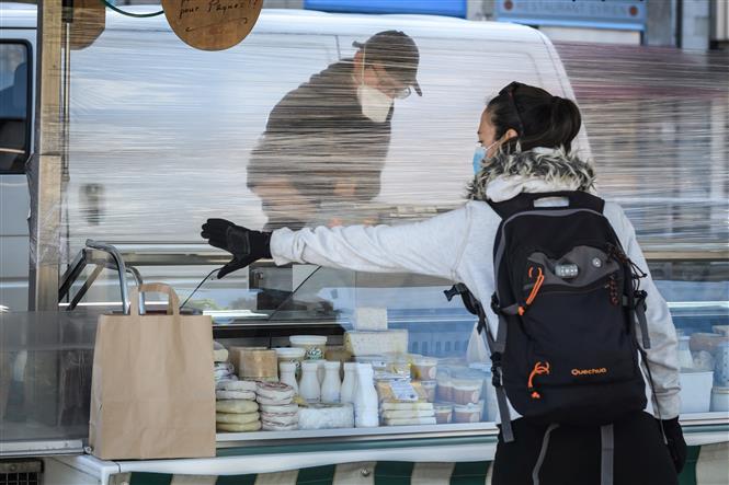 Một cửa hàng bán pho mát được trang bị tấm chắn để ngăn chặn lây lan của dịch COVID-19 tại Geneva, Thụy Sĩ, ngày 16/ 4/2020. Ảnh: AFP/TTXVN