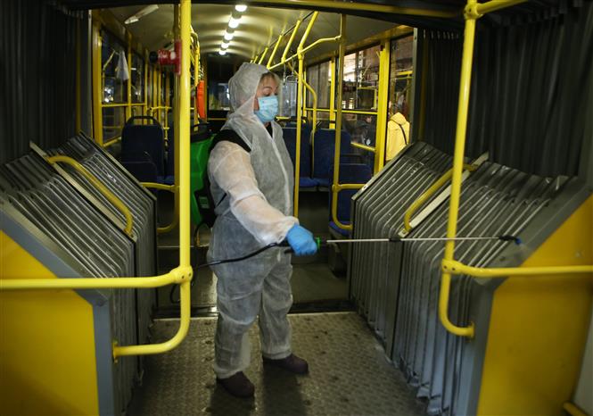 Nhân viên phun khử trùng một xe buýt nhằm ngăn chặn sự lây lan của dịch COVID-19 tại Kiev, Ukraine ngày 12/3/2020. Ảnh: THX/TTXVN