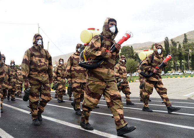 Quân đội Iran diễu hành với trang thiết bị y tế hôm 17/4. Ảnh chup màn hình