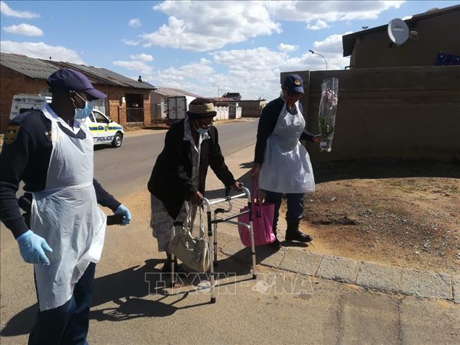 Cảnh sát giúp đỡ một người già trên đường đi mua thực phẩm tại ngoại ô thủ đô Pretoria hôm 7/3. Ảnh: Phi Hùng (P/v TTXVN tại Nam Phi)
