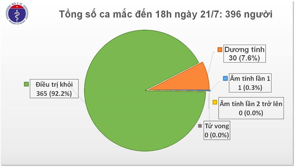 Theo Ban chỉ đạo quốc gia phòng chống dịch COVID-19, đến 18 giờ ngày 21/7, Việt Nam không có ca mắc mới. Trong ngày 21/7, có thêm 5 bệnh nhân COVID-19 ở Việt Nam được công bố khỏi bệnh.
