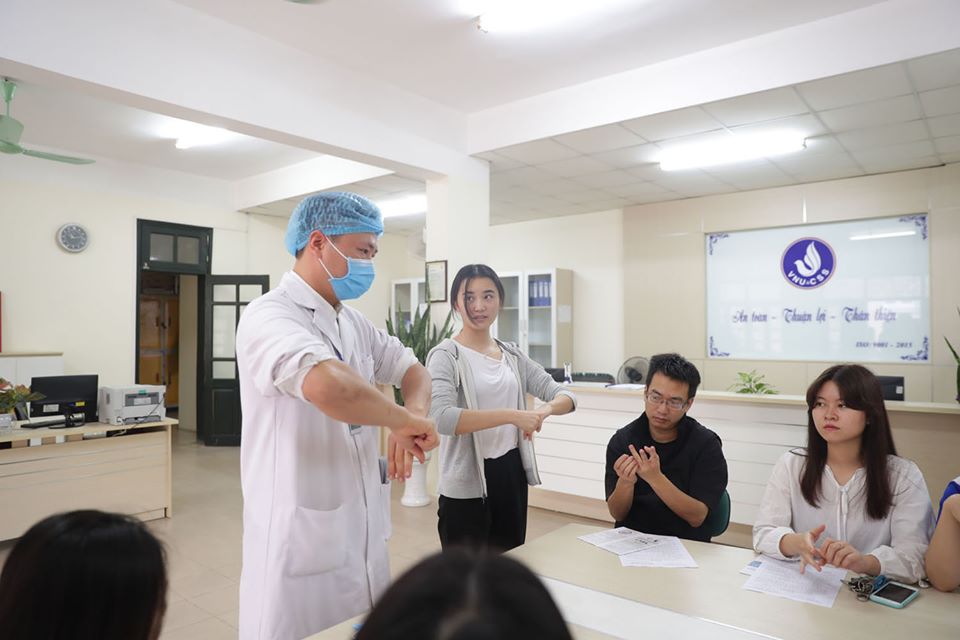 Sinh viên được hướng dẫn rửa tay đúng cách.
