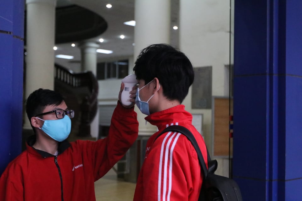 Sinh viên đo thân nhiệt trước khi vào toà nhà.