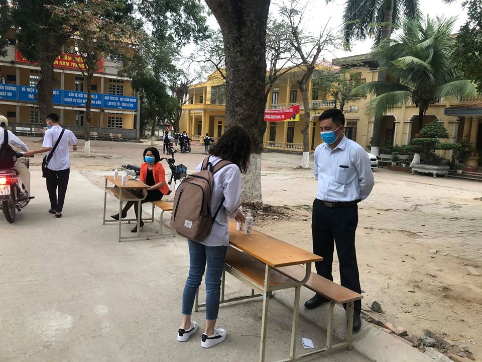 Từng học sinh được thầy cô đo thân nhiệt tại cổng trường rồi sát khuẩn tay trước khi lên lớp.