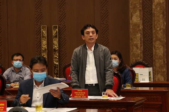 Giám đốc Trung tâm Bảo tồn di sản Thăng Long-Hà Nội Trần Việt Anh báo cáo tại buổi làm việc. Ảnh: Sở TT và TT Hà Nội