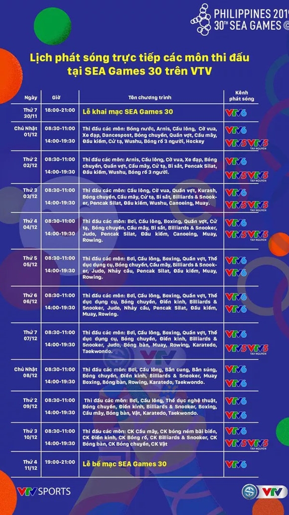 Lịch phát sóng các môn thi đấu của Đài Truyền hình Việt Nam. Ảnh: vtv sports