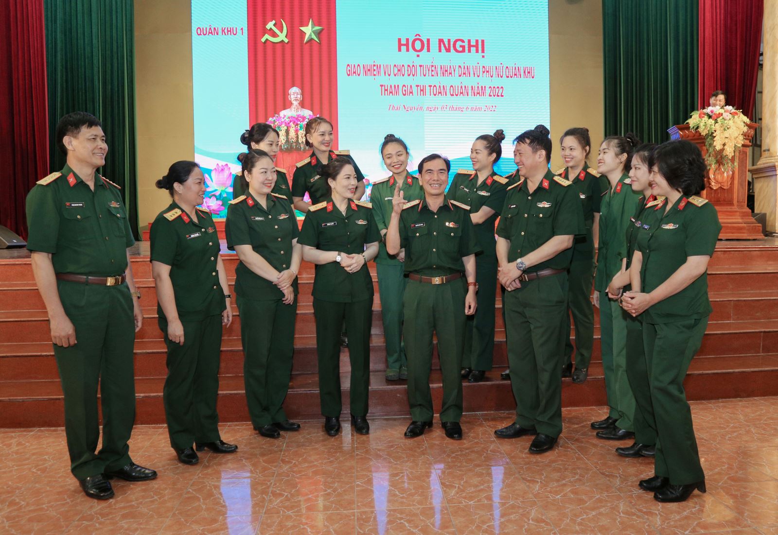 Thiếu tướng Nguyễn Đình Chiêu, Phó Chính ủy Quân khu chụp ảnh lưu niệm cùng đội tuyển nhảy dân vũ phụ nữ Quân khu tham gia thi toàn quân năm 2022.