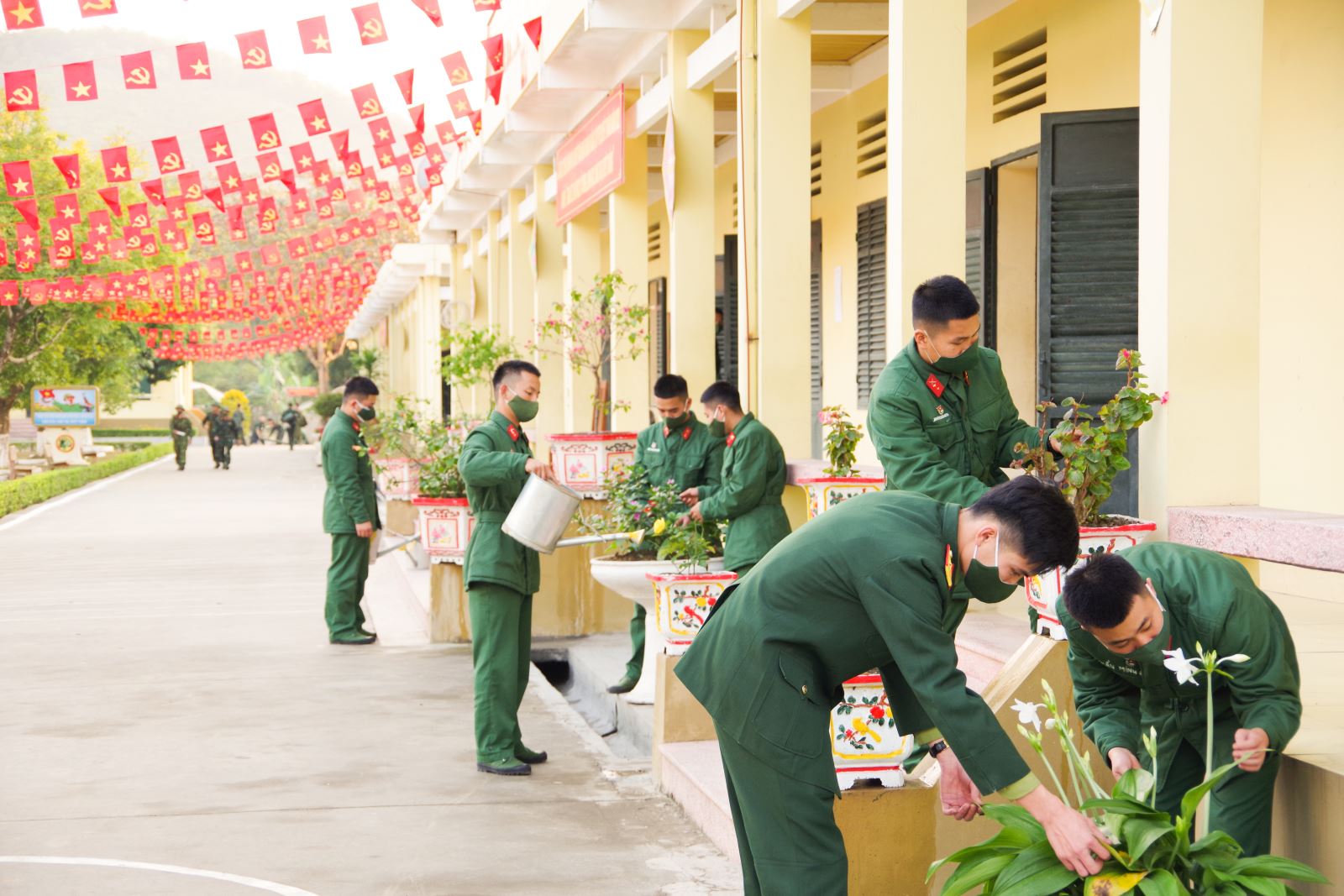 Cán bộ, chiến sĩ Đại đội 2, Tiểu đoàn 1, Trung đoàn 246, Sư đoàn 346 củng cố khuôn viên doanh trại chuẩn bị đón tết. Ảnh: NÔNG HỒI